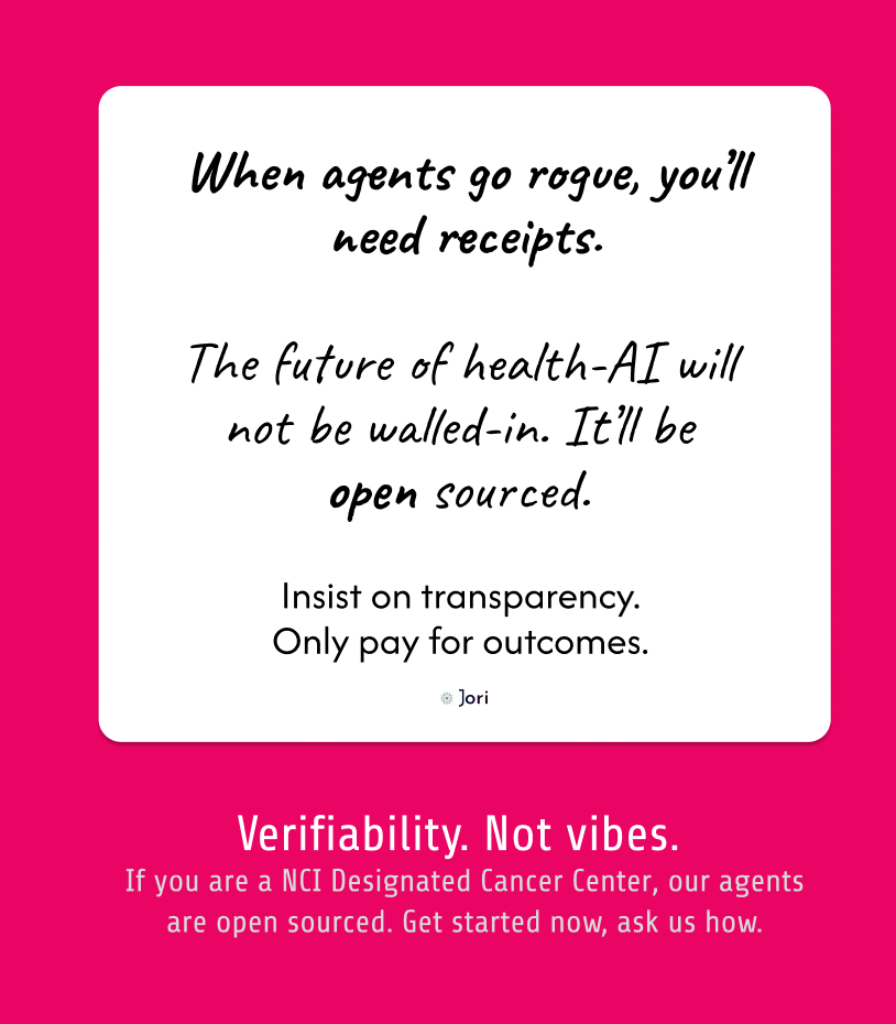 Which is why we're making our AI agents open source for NCI-designated centers. When intelligence becomes free, transparency becomes priceless.